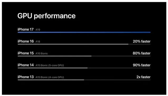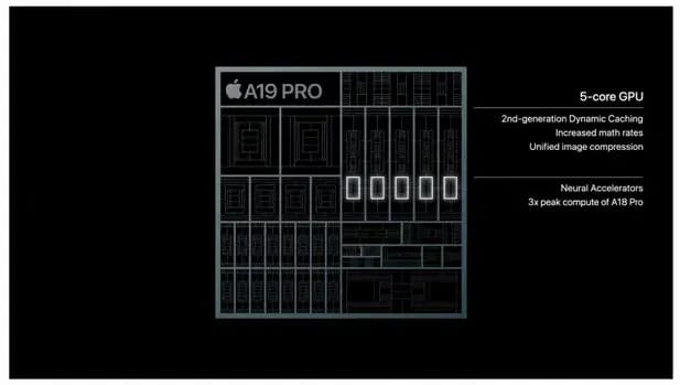 A19 Pro chip: Apple claims roughly three times the compute of the A18 Pro and “MacBook Pro-level” compute density. It also includes neural accelerators targeted at on-device inference.