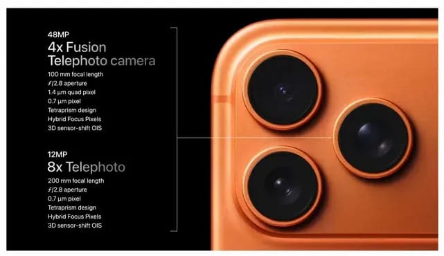All main sensors at 48MP; a new 200mm-equivalent telephoto at f/2.8 (up from 100mm equivalents in prior models).